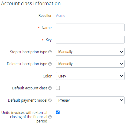 • Default account class — when the checkbox is selected, this account class is automatically assigned to new accounts registered via the Customer Control Panel.