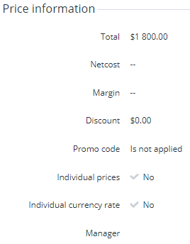 • Promo code — a promo code applied to the order (see Managing promo codes). In case of individual prices, indicates that a promo code is not applied.