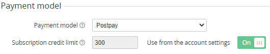 In the Payment model group, select and, if necessary, configure the payment model. The Prepay model does not require any configuration. For the Postpay model, you can redefine the subscription credit limit.