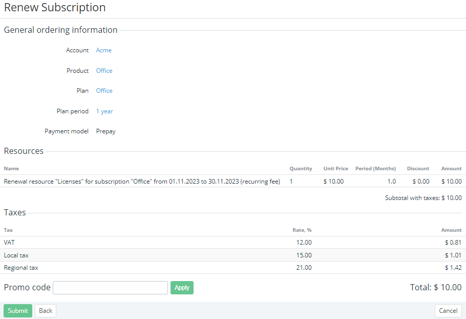 3. If it is necessary to get a discount for the account, in the Promo Code field, enter your code (see Managing promo codes) and click Apply.