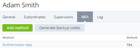 - Default — indicates whether a method is used by default on the second authentication step. In the current version of the platform, a manager can have only one MFA method added, so it is always used by default.