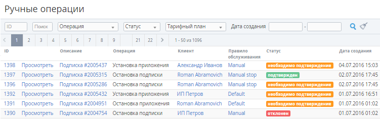 - Клиент - имя клиента, которому принадлежит подписка, к которой относится данная операция;