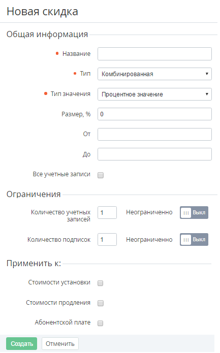 - Нажмите кнопку Создать. Новая скидка будет добавлена в Список скидок (см. Просмотр списка скидок).