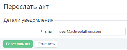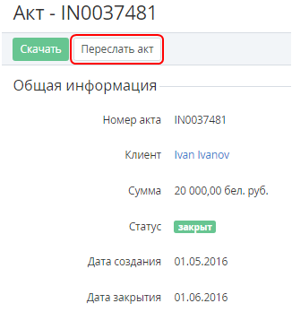 - Нажать кнопку Переслать акт. Акт будет повторно отправлен клиенту на указанный email.