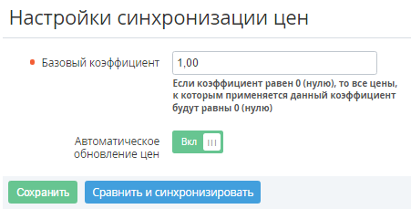 если переключатель установлен в положение Вкл - цены будут синхронизироваться автоматически (см. Автоматическая синхронизация цен Тарифных планов);