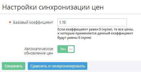 - Коэффициент наценки - величина коэффициента наценки, установленного на странице Настройки синхронизации цен.