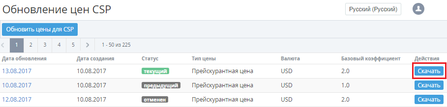 - На Панели навигации перейти в раздел Настройки > Модули > Обновление цен CSP. В рабочей области отобразится страница Обновление цен CSP (см. Просмотр списка загруженных файлов цен).