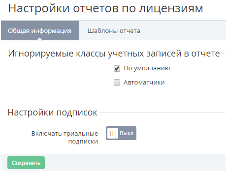 - Включать триальные подписки - управление опцией включения/исключения в отчет информации об использовании лицензий в пробных подписках.