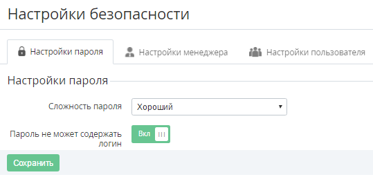 - Установить переключатель Пароль не может содержать логин в положение Вкл для активации проверки пароля на наличие в нем логина пользователя.