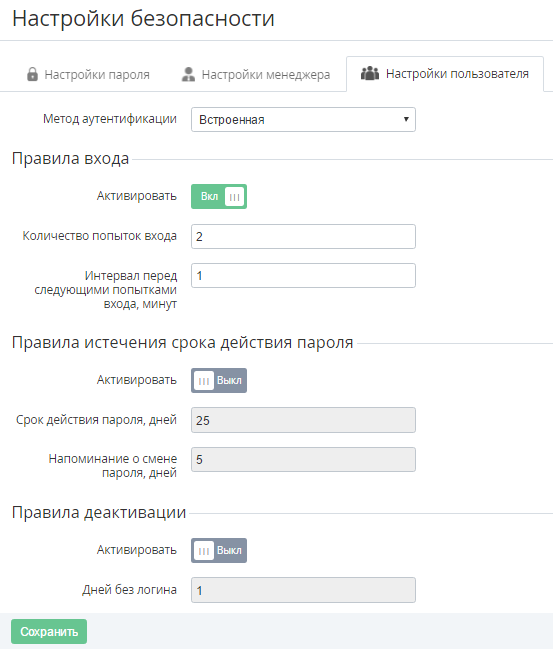 В полеКоличество попыток входа ввести количество попыток входа в систему при неверном указании пароля или логина.