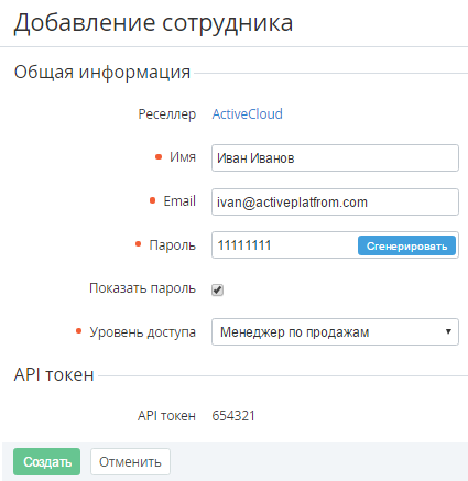 API токен отображает уникальный код безопасности, который необходим для аутентификации при использовании некоторых методов API (см. ActivePlatform. Руководство по использованию API).