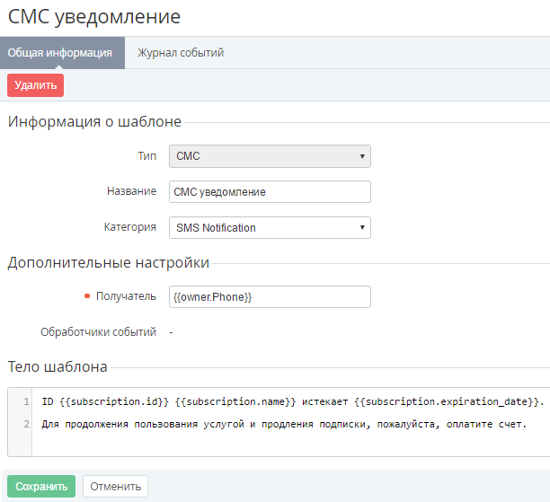 - Щелкнуть на ID или Названии необходимого шаблона. Возникнет страница шаблона уведомлений.
