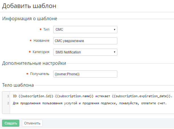 Создание Шаблона СМС уведомлений