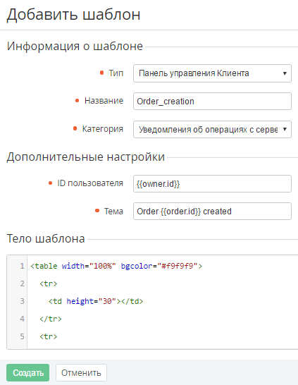 Создание Шаблона уведомлений Панели управления Клиента