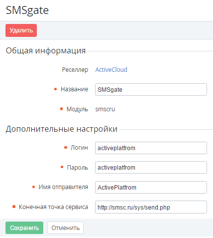 • Логин и Пароль - логин и пароль для доступа к SMS-сервису;