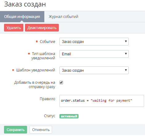 - Журнал событий - история изменений данного события уведомлений (см. Журнал событий).