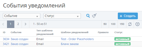 - На Панели навигации перейти в раздел Настройки > Уведомления > События уведомлений. В рабочей области отобразится Список событий уведомлений.