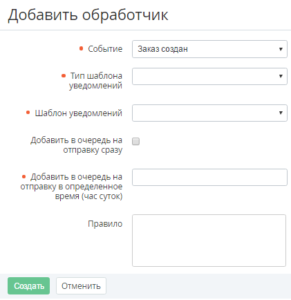 - На Панели инструментов страницы Событий уведомлений нажать кнопку Создать. В рабочей области появится страница Добавить обработчик.