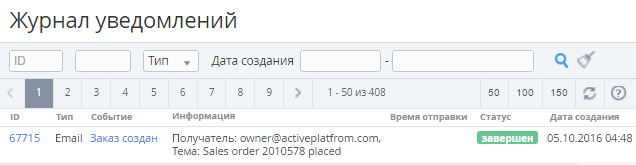 Журнал уведомлений - журнал отправки Уведомлений (см. Настройка Уведомлений) для информирования Пользователей Клиентов и Сотрудников о возникновении определенного События в ActivePlatform.