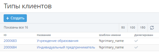 2. На Панели навигации перейти в раздел Настройки > Биллинг > Типы клиентов. В рабочей области отобразится страница Типы клиентов.