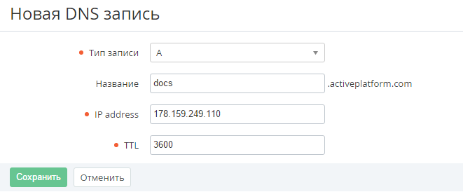 В качестве примера рассмотрим создание А-записи. Запись A связывает имя хоста с адресом протокола IPv4. Для создания А-записи необходимо указать следующие данные:- Название - доменное имя, к которому привязана или которому «принадлежит» данная ресурсная запись. Если требуется создать запись для основного домена, то поле Название необходимо оставить пустым. Если необходимо создать А-запись для поддомена (например, docs.activeplatform.com), то в поле Название необходимо указать поддомен (в данном примере - docs);
