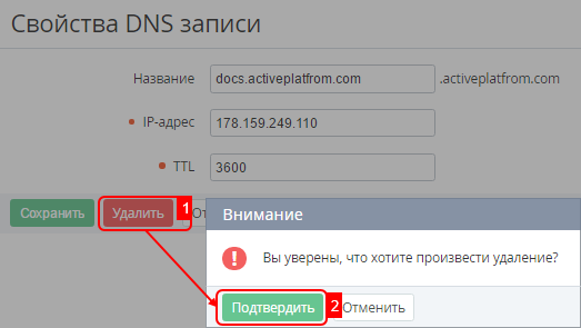 - На странице Свойства DNS записи нажать кнопку Удалить.