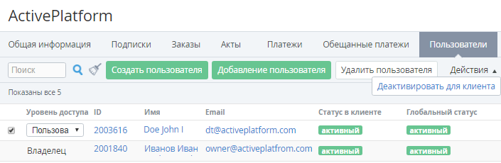 - На Панели инструментов вкладки Пользователи нажать кнопку Действия и выбрать пункт Деактивировать для клиента. Доступ Пользователя к Панели управления Клиента для выбранного клиента будет прекращен. Статус в клиенте изменится с Активный на Неактивный.