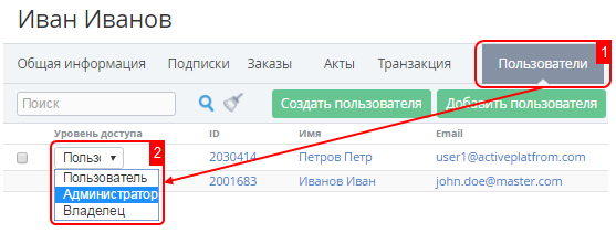 • Владелец - пользователь с максимальными привилегиями. У Клиента может быть только один пользователь с уровнем доступа Владелец. При выборе данного значения, создаваемый пользователь получит уровень доступа Владелец, a пользователь, который ранее обладал правами Владелец, получит уровень доступа Администратор;
