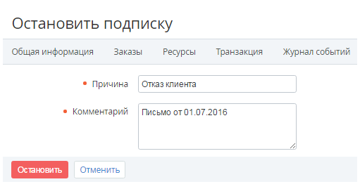 - В поле Комментарий указать дополнительную информацию об остановке подписки.