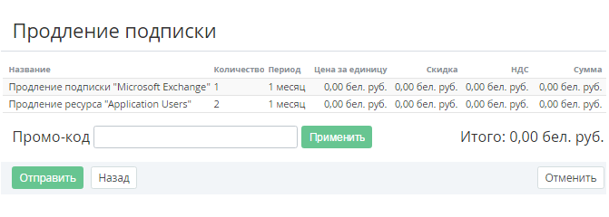 - При необходимости применить скидку в поле Промо-код ввести код (см. Создание Промо-кода вручную) для предоставления скидки клиенту.