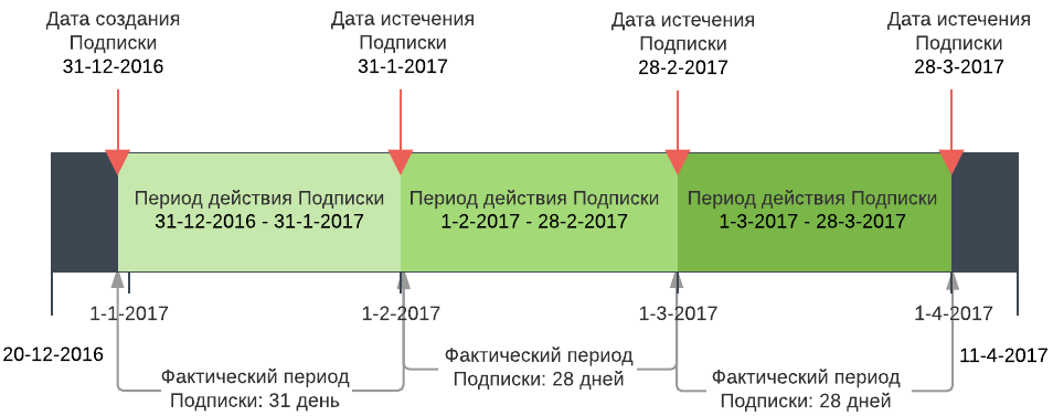 - 31.12.2016 создается новая Подписка. Так как период действия Подписки один месяц Дата истечения подписки устанавливается как 31.01.2017. Подписка доступна для использования с 31.12.2016 по 31.01.2017 включительно. Фактический период действия подписки 31 день.