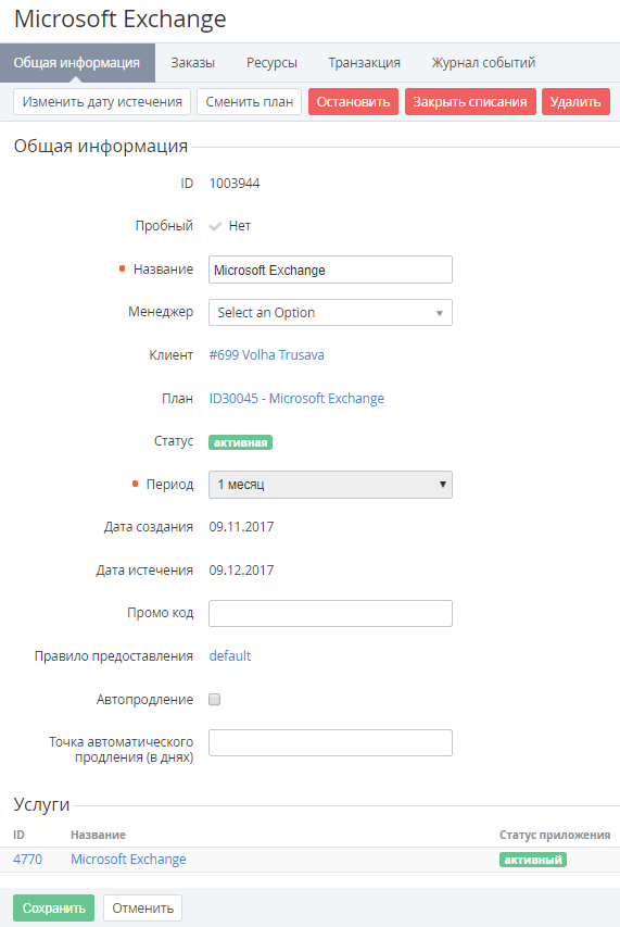- Точка автоматического продления (в днях) - количество дней до истечения подписки, когда Клиент получает счет на продление. Счет на оплату выставляется со статусом Ожидает оплаты. Если данный счет не был оплачен Клиентом вручную, то в день истечения подписки, если установлен флажок Автопродление, то при наличии достаточного количества средств на Балансе, производится автоматическая оплата данного счета.