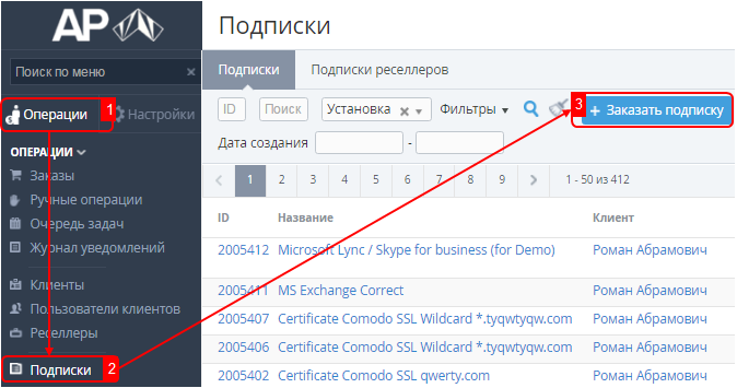 - На Панели навигации перейти в раздел Операции > Операции > Подписки. В рабочей области появится страница Подписки.