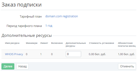 - Количество - количество заказываемых подписок и дополнительных ресурсов;