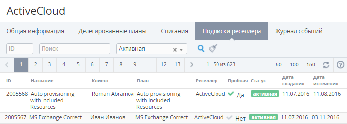 4. Перейти на вкладку Подписки реселлера. В рабочей области отобразится содержимое данной вкладки.