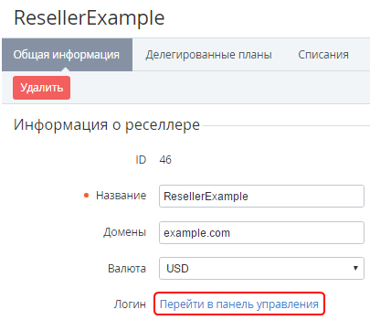 - На вкладке Общая информация нажать ссылку Перейти в панель управления. Произойдет вход в Панель управления Реселлера.