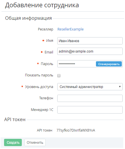Чтобы добавить Сотрудника реселлера, который будет использоваться для доступа в Панель управления Реселлера, необходимо: