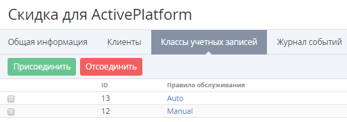 - Щелкнуть на ID или Названии необходимой скидки типа Клиент или Комбинированная. В рабочей области появится страница с подробной информацией о выбранной скидке.