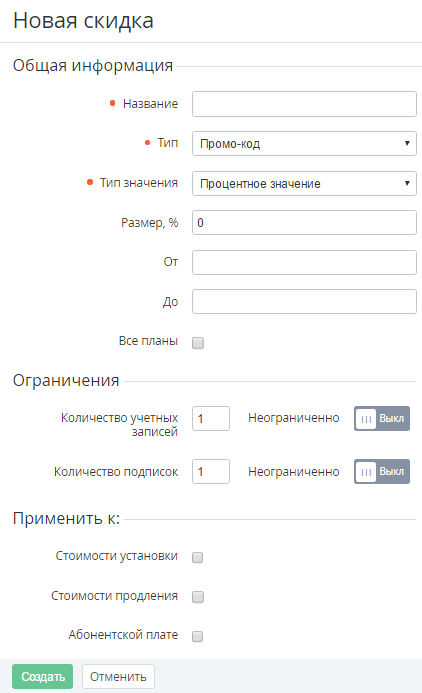- Для использования данной скидки типа Промо-код для всех Тарифных планов необходимо установить флажок Все планы. Если флажок Все планы сброшен, то после создания скидки необходимо будет указать Тарифные планы, для которых будет действовать данная скидка(см. Ограничение применения Скидки по Тарифному плану).