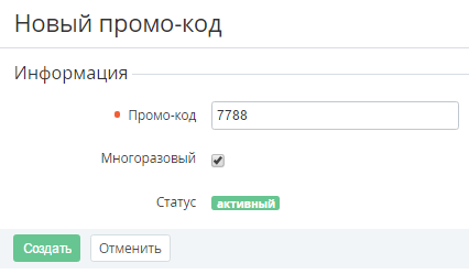 - Нажмите кнопку Создать. Добавленный промо-код будет создан и появится в Списке промо-кодов (см. Просмотр Списка промо-кодов).
