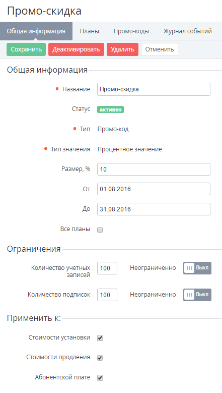 Планы - список Тарифных планов, связанных с выбранной скидкой (см. Создание Скидки на Тарифный план). Вкладка доступна для скидок типов Промо-код и Комбинированная;