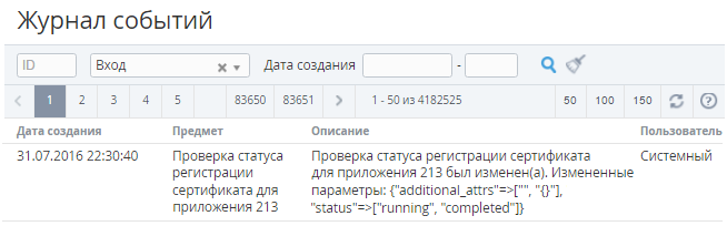 Сортировка информации в Журнале событий осуществляется по следующим столбцам: ID, Описание, Дата создания (см. Сортировка записей).