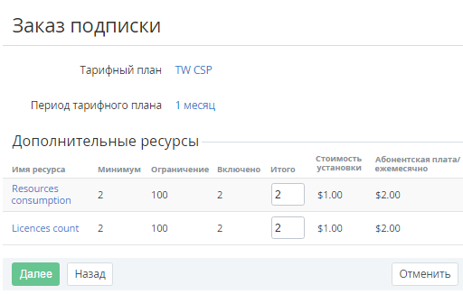 - Количество - количество заказываемых подписок и дополнительных ресурсов;