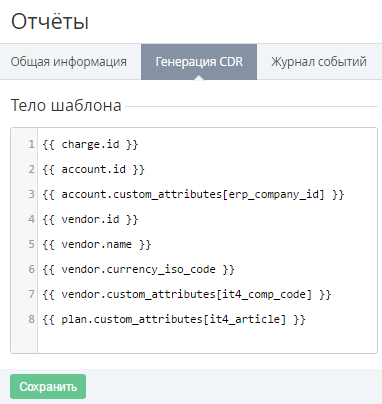 В поле Тело шаблона задать шаблон генерируемого CDR файла. Поле поддерживает Плейсхолдеры (см. Использование Плейсхолдеров), которые относятся только к данному Списанию.