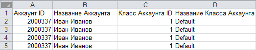 Полученный отчёт в формате MS Exсel содержит следующие столбцы:Аккаунт ID - уникальный идентификационный номер Клиента (см. Управление Клиентами), Подписка которого сгенерировала Списание;