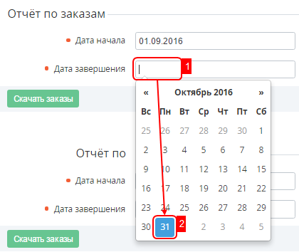 - В группе элементов Отчёт по заказам с помощью Календаря установить период формирования отчета в полях Дата начала и Дата завершения.