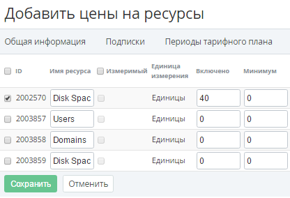 - Установить флажки в строках ресурсов, которые должны входить в тарифный план.