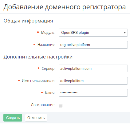 - Нажать кнопку Создать. Новый Доменный регистратор будет создан и отобразится в Списке регистраторов (см. Просмотр списка доменных регистраторов).