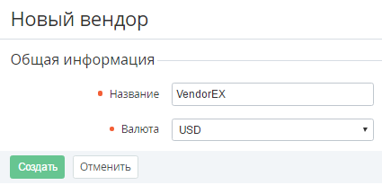 - Нажать кнопку Создать. Новый вендор будет создан и отобразится в Списке вендоров (см. Просмотр списка вендоров).