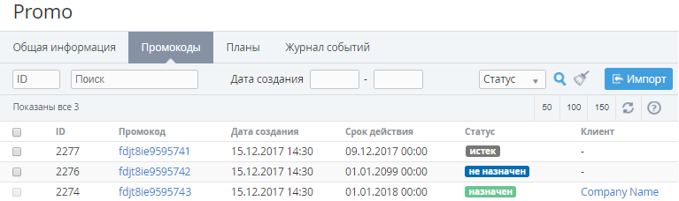 - На Панели инструментов нажать кнопку Импорт. Отобразится страница Импорт промо-кодов.